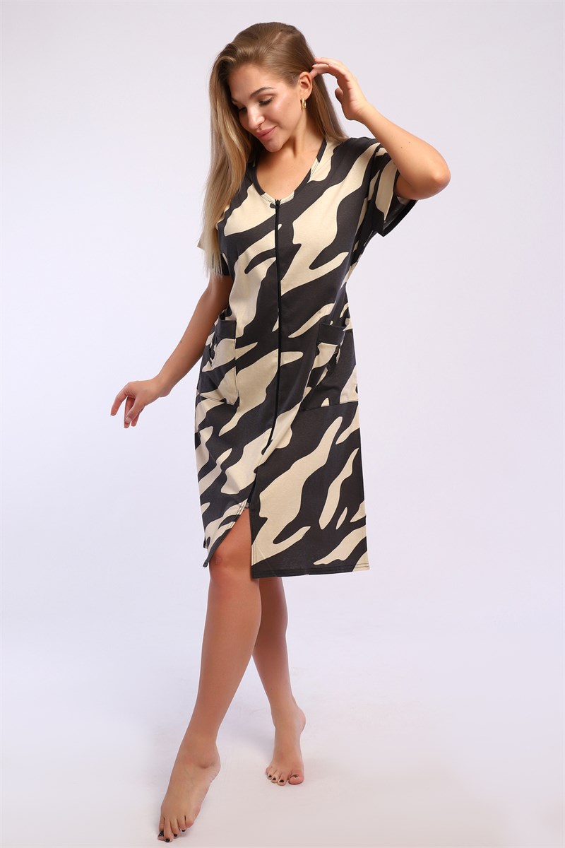 Этот халат выполнен в современном камуфляжном стиле с преобладанием черных и бежевых цветов. Он имеет короткие рукава и длину до колена, что делает его удобным и практичным для повседневного ношения. Спереди халат застегивается на молнию, что обеспечивает легкость надевания и снятия. На боковых сторонах имеются два глубоких кармана с оригинальными овальными прорезями, которые добавляют модели функциональности и стильности. Халат также дополнен поясом, который подчеркивает талию и позволяет регулировать посадку по фигуре. Материал, из которого изготовлен халат, мягкий и приятный к телу, что обеспечивает комфорт при носке.