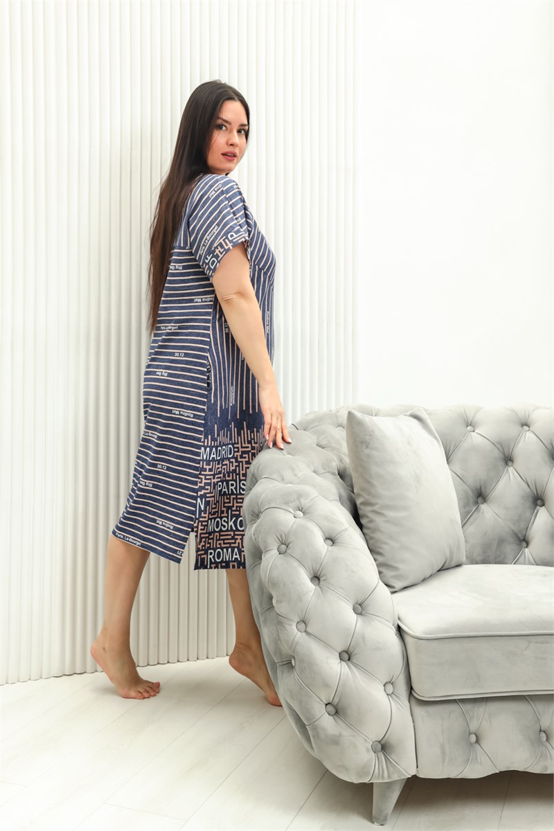 Халат с застежкой на молнию, полуприлегающего силуэта, длиной ниже колена, с V-образной горловиной. Рукав спущенный, короткий, с манжетом. В верхней части полочки расположены кокетки. Спинка с кокеткой. С разрезами в нижней части боковых швов. Горловина обработана бейкой из основного полотна.
