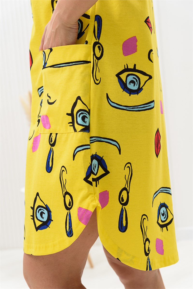 Халат на молнии, прямого силуэта, длиной выше колена, с фигурной линией низа, с удлиненной спинкой, с округлой горловиной, с накладными карманами. Рукав цельнокроеный, короткий, с манжетом. Горловина обработана бейкой из отделочного полотна.