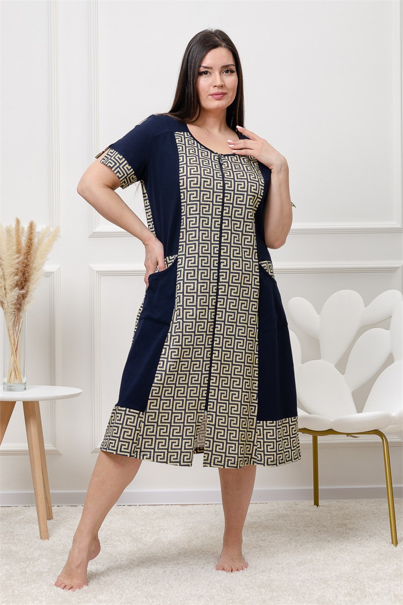 Халат на молнии, полуприталенного силуэта, длиной ниже колена, с округлой горловиной, с фигурными боковыми карманами. Полочка и спинка с вертикальными рельефами. Рукав втачной, короткий, с разреами и манжетом из отделочного полотна. Горловина и карманы обработаны бейкой.