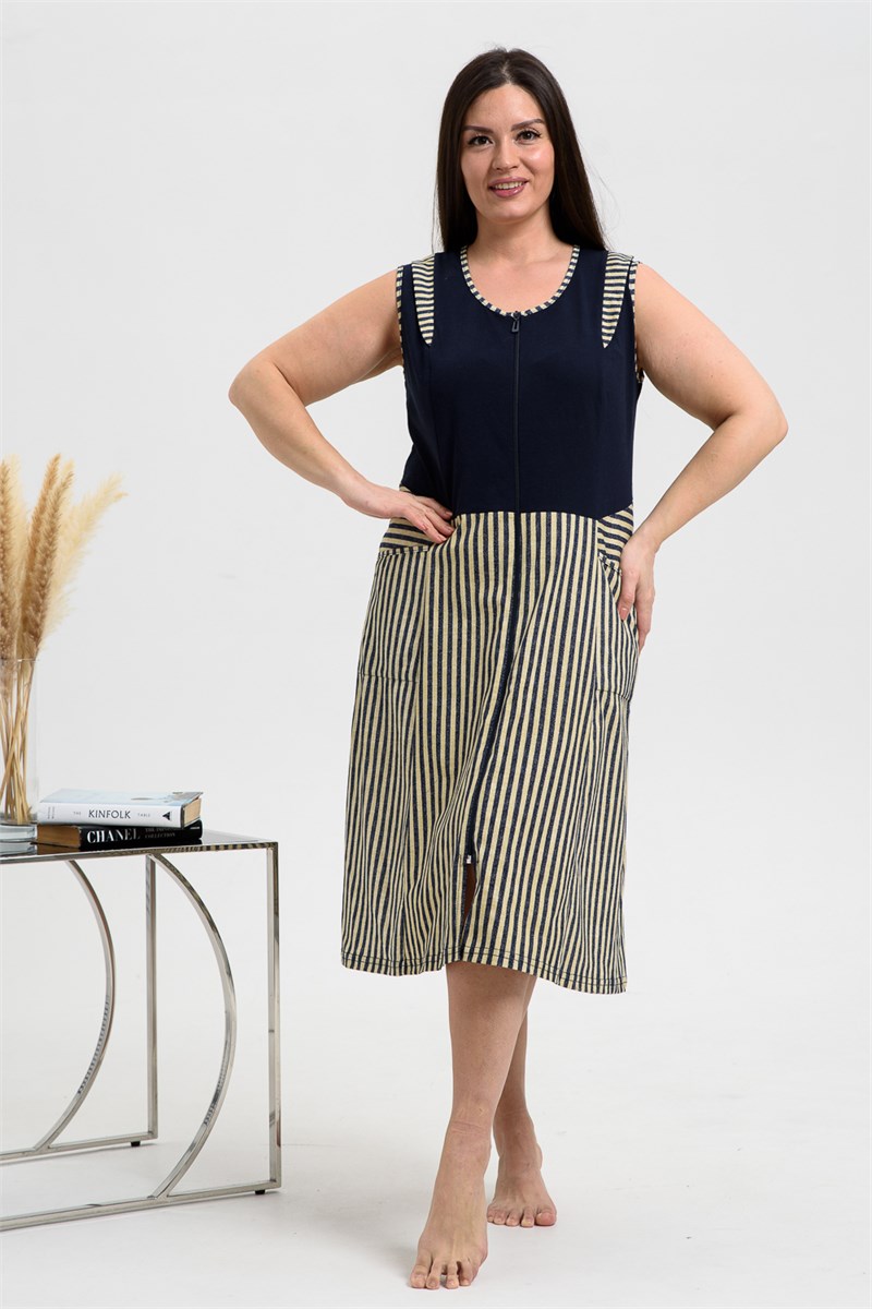 Халат на молнии, полуприталенного силуэта, без рукава, с округлой горловиной, длиной ниже колена, с боковыми карманами. Полочка и спинка с вертикальными рельефами. Верхняя часть халата выполнена из отделочного полотна. Горловина, проймы и карманы обработаны бейкой из основного полотна.