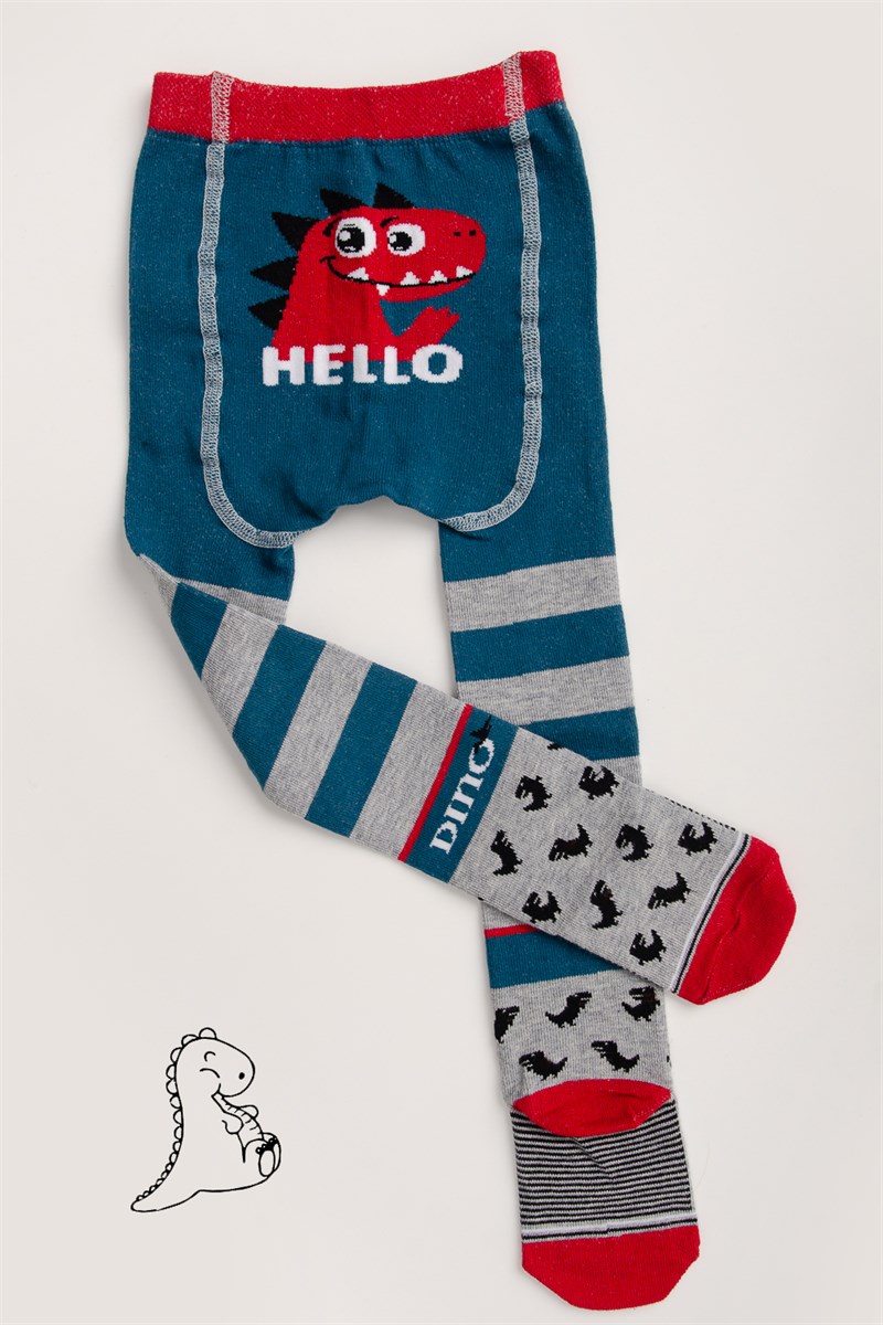 Оригинальные детские колготки. На задней части рисунок динозаврика и надпись HELLO, на ножках рисунки динозавров и полосы.