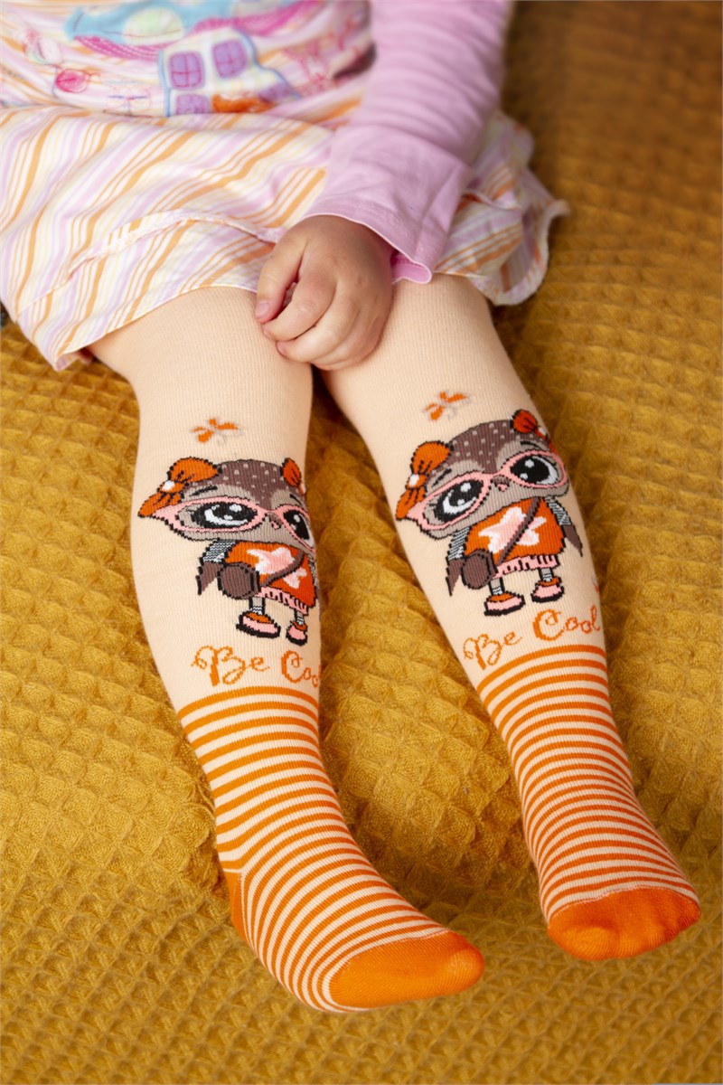 Оригинальные детские колготки. Однотонная основа, носок в полоску. С обеих сторон вывязана сова и надпись Be Cool