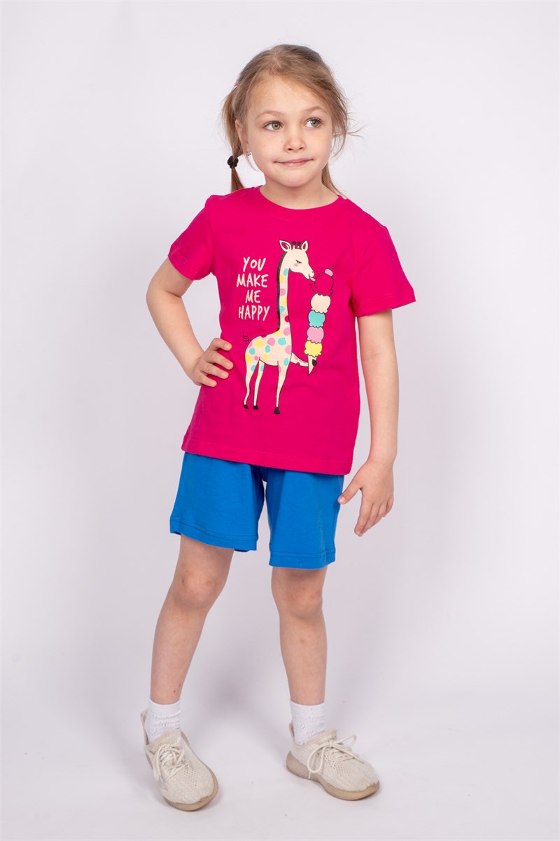 Комплект для девочки, состоящий из футболки и шорт. Футболка для девочки прямого силуэта с втачным коротким рукавом. Горловина круглая обработана воротником из рибаны. На полочке принт шелкография. Надпись переводится как Ты делаешь меня счастливой. Шорты для девочки прямого силуэта. Цельнокроеный пояс, с эластичной тесьмой внутри. Низ изделия обработан швом в подгибку.