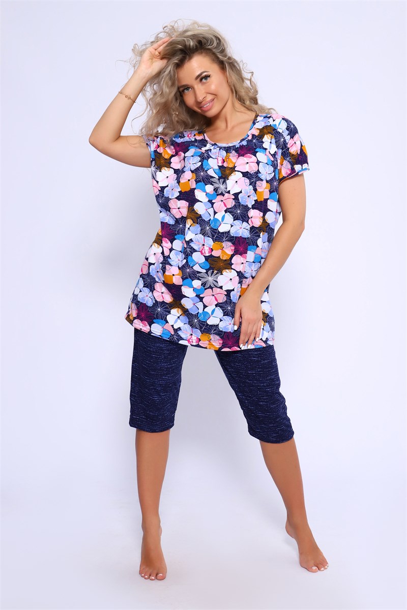 Женский костюм состоит из туники и бридж. Туника свободного кроя со сборкой на плечах и по центру выреза горловины. Бриджи с карманами по бокам.