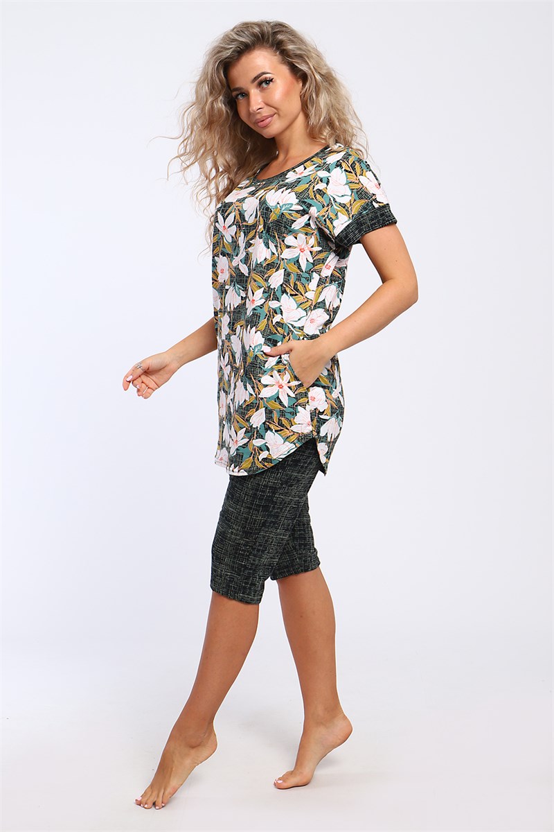 Костюм состоит из туники и бридж. Туника свободного кроя с манжетами на спущенном плече, боковыми карманами и полукруглым низом.