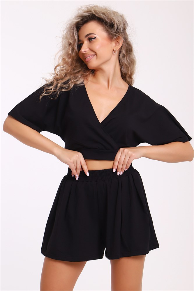 Костюм состоит из топа и шорт. Топ с лифом на запах и короткими цельнокроеными рукавами. Шорты свободного кроя и с высокой посадкой.