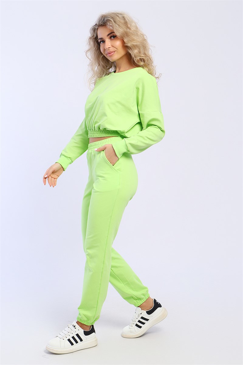 Костюм женский для повседневной носки. Данная модель выполнена из трикотажного полотна футер 2-х нитка. Толстовка свободного покроя с втачным рукавом. Манжеты на рукавах и горловина выполнены из эластичного трикотажного полотна кашкорсе. Пояс на толстовке и брюках выполнены из основной ткани под поясную машинку (отделочная тройная строчка). Брюки имеют по бокам карманы. По низу брюк вшита резинка 2,5 см.