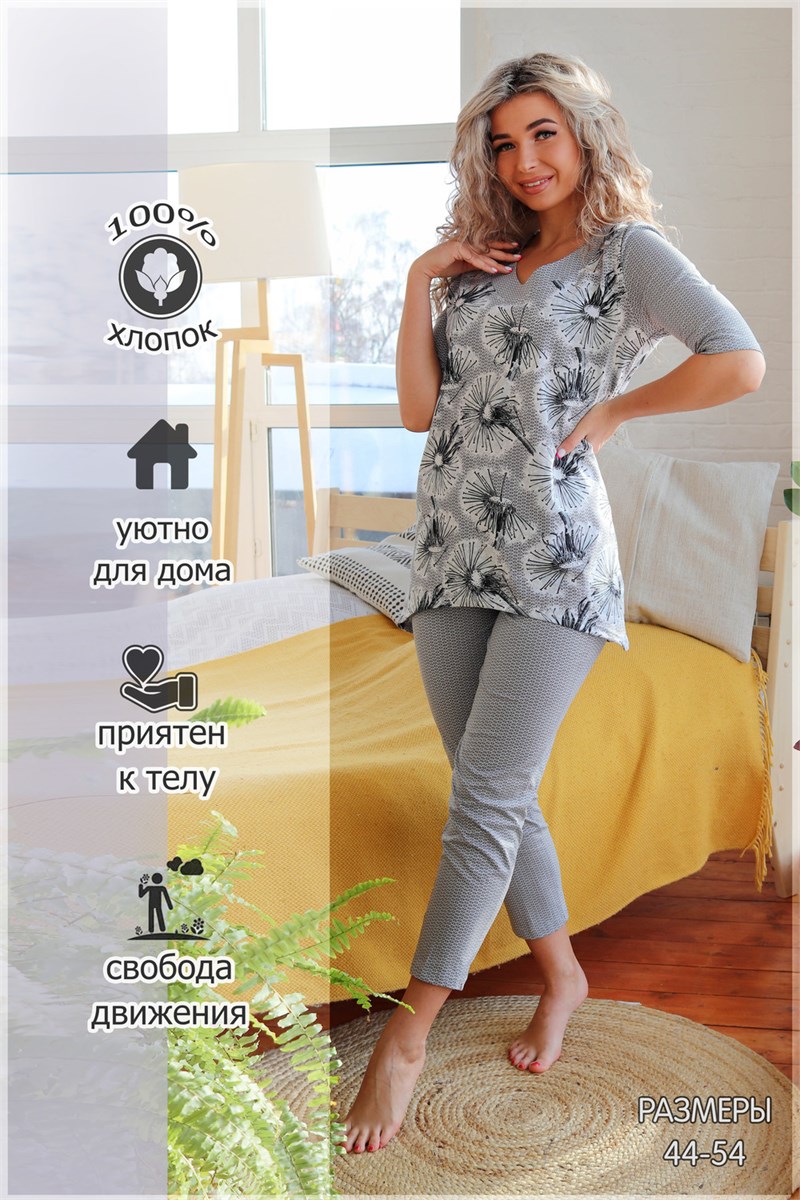 Удобная, мягкая, уютная пижама из хлопка с забавными принтами станет вашей любимой одеждой для дома. Костюм состоит из туники с модным рисунком и бриджей. Вы будете комфортно себя чувствовать в любой обстановке. Только вам решать как использовать комплект. В качестве любимой пижамы, как одежду для дома или для дачи. Натуральная хлопковая ткань и милый принт сделает вас центром внимания. Такой комплект прекрасно подойдёт и в качестве подарка любимым женщинам всех возрастов.