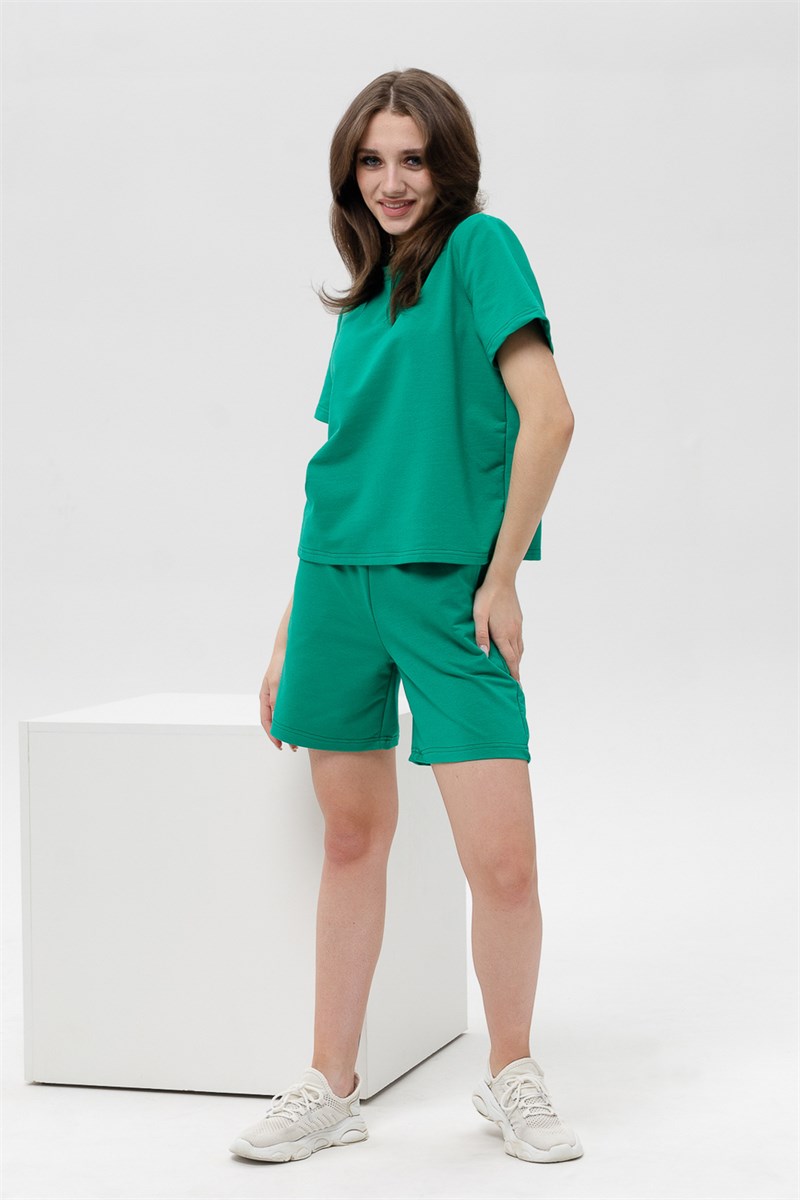 Женский костюм из футболки с шортами. Верх: однотонная футболка с коротким рукавом. Комфортная футболка для дома и занятий спортом. Актуальный крой и трендовые расцветки модели делают её универсальной для летнего гардероба. Низ: Шорты свободного покроя с карманами. Костюм спортивный в приятных модных расцветках. Комплект будет идеально смотреться как домашний и как спортивный на летний сезон. Костюм сшит из футера. Это износостойкая, приятная на ощупь, мягкая ткань из натурального хлопка. За ней легко ухаживать.