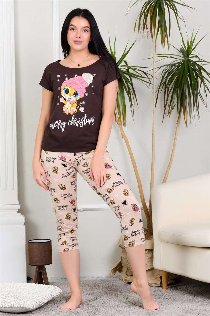 Молодёжный костюм с ярким принтом с изображением символа 2022 года. Футболка слегка приталенного силуэта, горловина в виде лодочки, спущенная пройма. Бриджи на распошитом притачном поясе, с удобными карманами по бокам, низ обработан манжетами. Костюм домашний, комфортный, из натурального 100% хлопка.