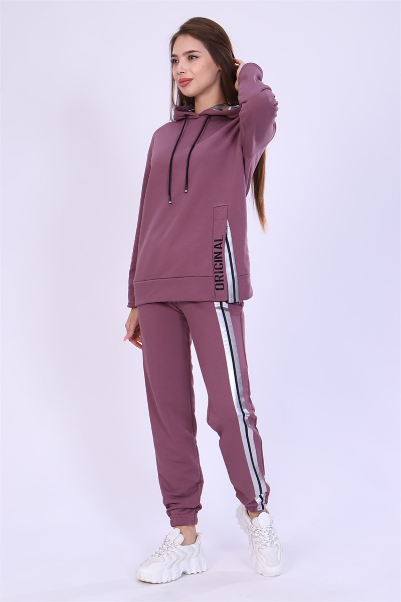 Костюм женский с принтом из футера 3-х нитки петля качества пенье. Свободная толстовка с капюшоном, обработанным внутри стильной тканью бифлекс; спущенная пройма, длинный рукав, низ передней полочки декорирован шлицей и принтом в виде надписи. Брюки прямые, полуприлегающего силуэта на распошитом поясе с удобными карманами, слегка зауженные к низу на резинке, украшены принтом в виде имитации лампаса, Тёплый, стильный костюм сделает ваш образ неповторимым. Это отличный выбор на холодную погоду. Благородные цвета изделия придают ему роскоши и элегантности.
