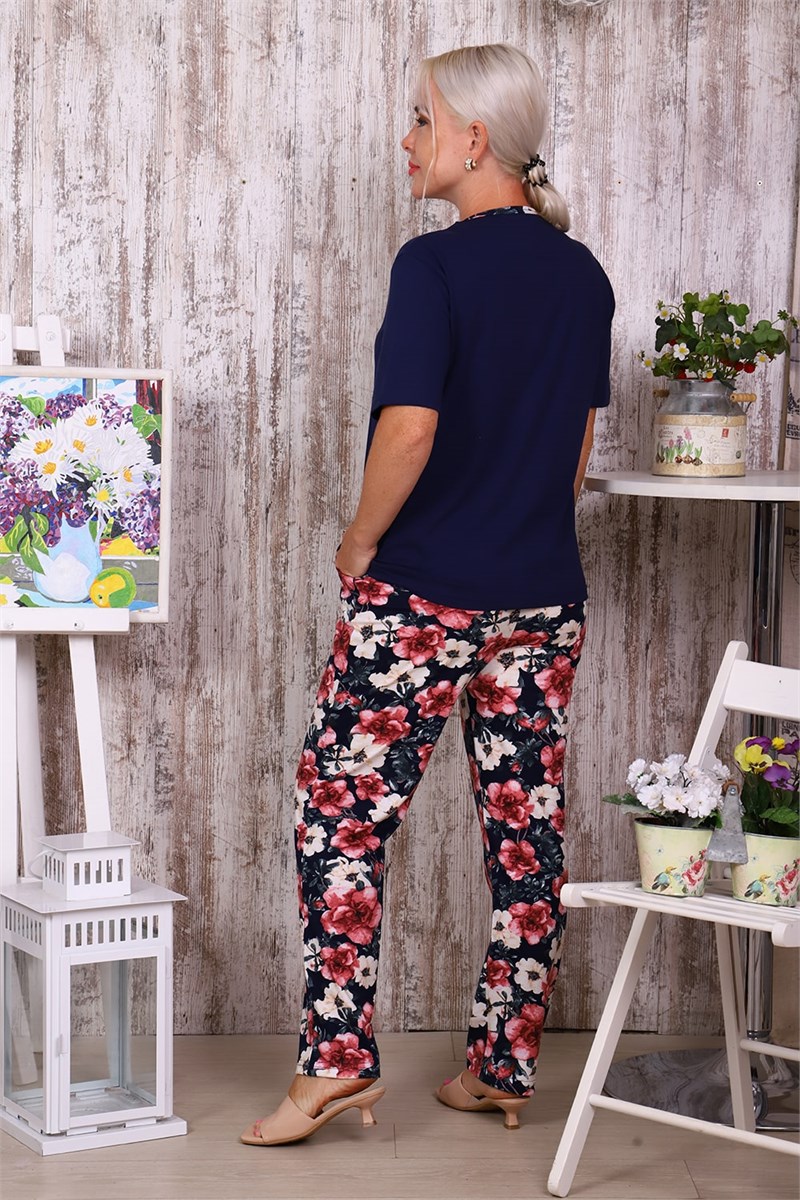 Костюм женский - футболка с ярким принтом и коротким рукавом и брюки. Горловина обработана кантом в цвет брюк. Брюки на поясе с боковыми карманами из цветной ткани. Низ брюк обработан плоским швом.