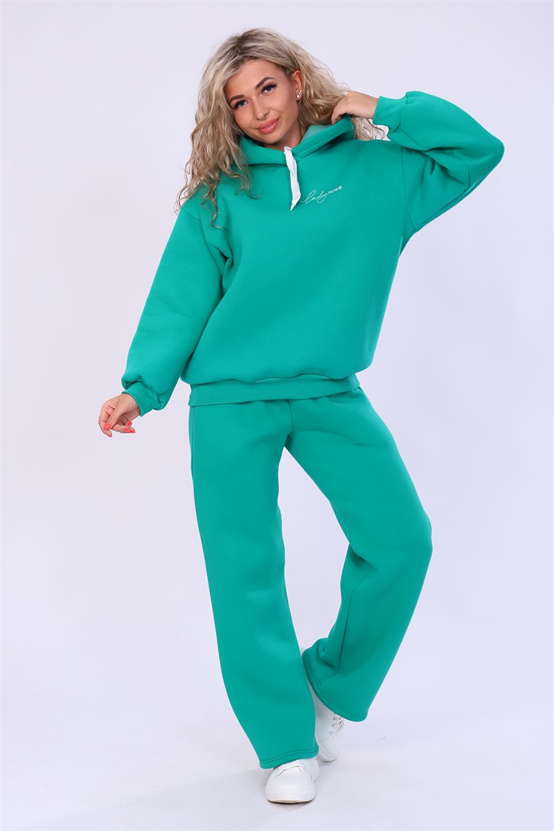Костюм состоит из толстовки с капюшоном и брюк, из приятной мягкой ткани. Капюшон фиксируется шнуром. Пояс и рукав толстовки на манжете, на полочке вышивка. Брюки с карманами. Модель особенно удобна и комфортна в прохладное время года.