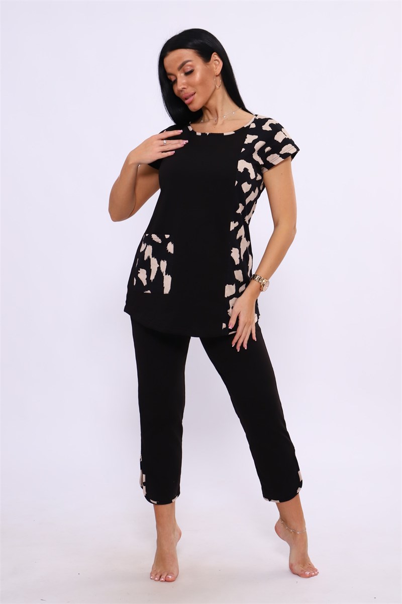Костюм футболка и бриджи. Футболка со спущенным плечом без рукава с карманом. Бриджи удлиненные с карманами.