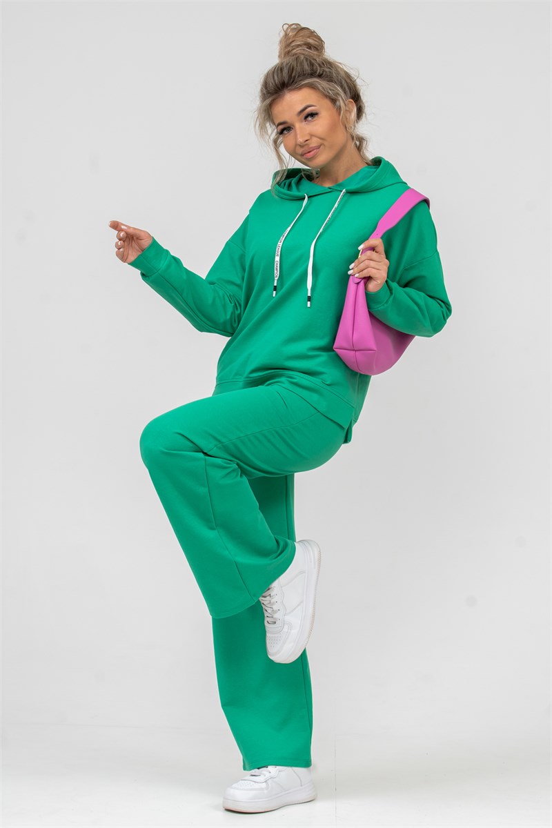 Женский костюм 2-ка выполнен из футера высокого качества с хлопком и небольшим добавлением полиэстера и лайкры, что позволяет изделию не скатываться и оставлять идеальный внешний вид на долгое время. Костюм состоит из толстовки и брюк. Изделие выполнено в стиле умеренный oversize, модном и излюбленном тренде современности. Линия плеча спущена, а рукав и низ толстовки дополнены манжетами. Брюки палаццо с высокой посадкой, боковыми карманами, и поясом обработанным на специализированной поясной машине, делают их более удобными и комфортными. Свободный крой прекрасно будет смотреться на дамах с любой фигурой. Костюм модных расцветок - это удачный выбор для поездок в отпуск, занятия спортом, на пикник, для активного отдыха и прогулок по городу. А также гармонично сочетаться как с кроссовками, так и с туфлями, балетками или босоножками. Костюм такого плана - это то, что выделяет Вас среди других, придавая изюминку и непосредственность новомодным аутфитам. Ориентируясь по таблице замеров, обратите внимание, что замеры длины рукава проводились от точки основания шеи.