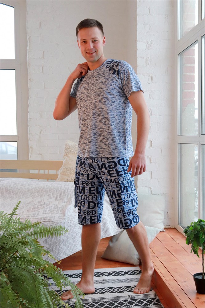 Мужской костюм. В комплекте футболка классического кроя с коротким рукавом. Яркие шорты с карманами, длина чуть ниже колена.