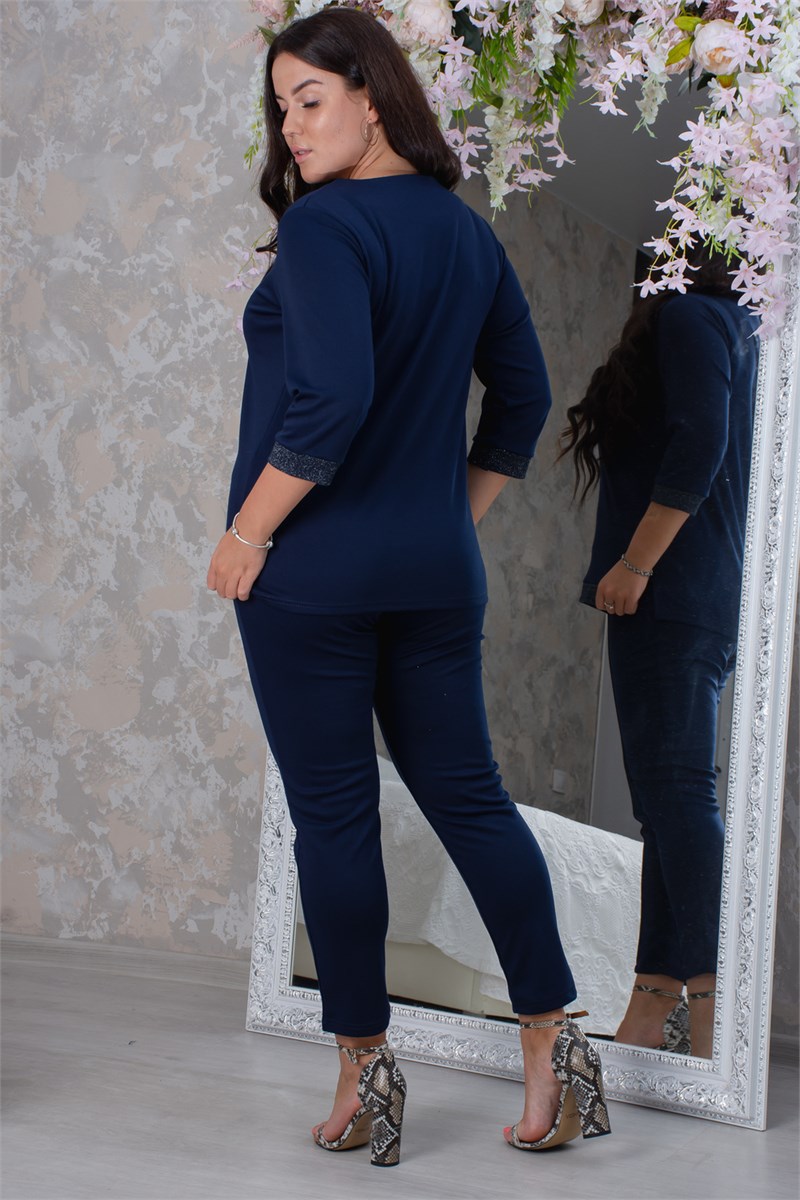 Костюм женский представлен из прекрасного мягкого трикотажного полотна Милано. Он состоит из туники прямого кроя, по бокам с разрезиками, спинка чуть удлиненная, рукава 3/4 на манжетах из отделочного материала, перед украшен вставкой. Брюки зауженного кроя с высокой посадкой и отстрочкой в виде стрелки по переду. Пояс на резинке.