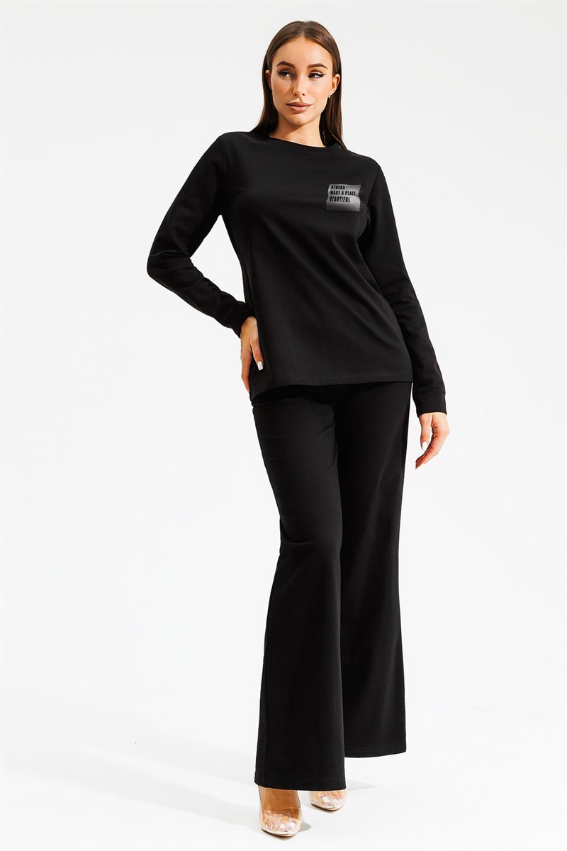 Костюм женский из футера 2 нитки, состоит из туники и брюк. Туника полуприлегающего силуэта, длиной до бедер, рукав втачной, длинный, с манжетой по низу. Горловина округлой формы с обтачкой. По переду нанесен дизайнерский принт. Брюки прямые, свободные, длинные. Притачной пояс на резинке, внутренние боковые карманы с наклонным входом.