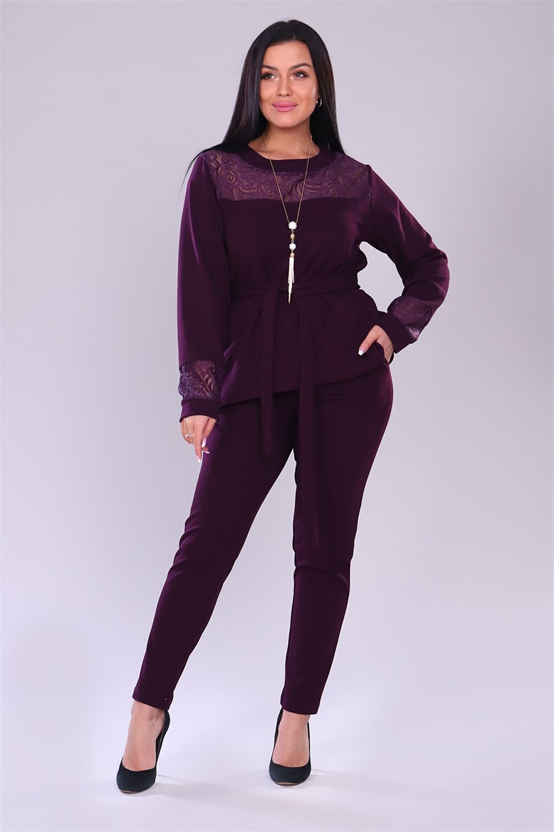 Костюм брючный. Брюки с карманами на притачном поясе. Кофта свободная, к низу расклешенная, перед чуть короче, чем задняя половина. Кокетка из кружева, рукав длинный на манжете, с элементами кружева. Аксессуары в комплект не входят.