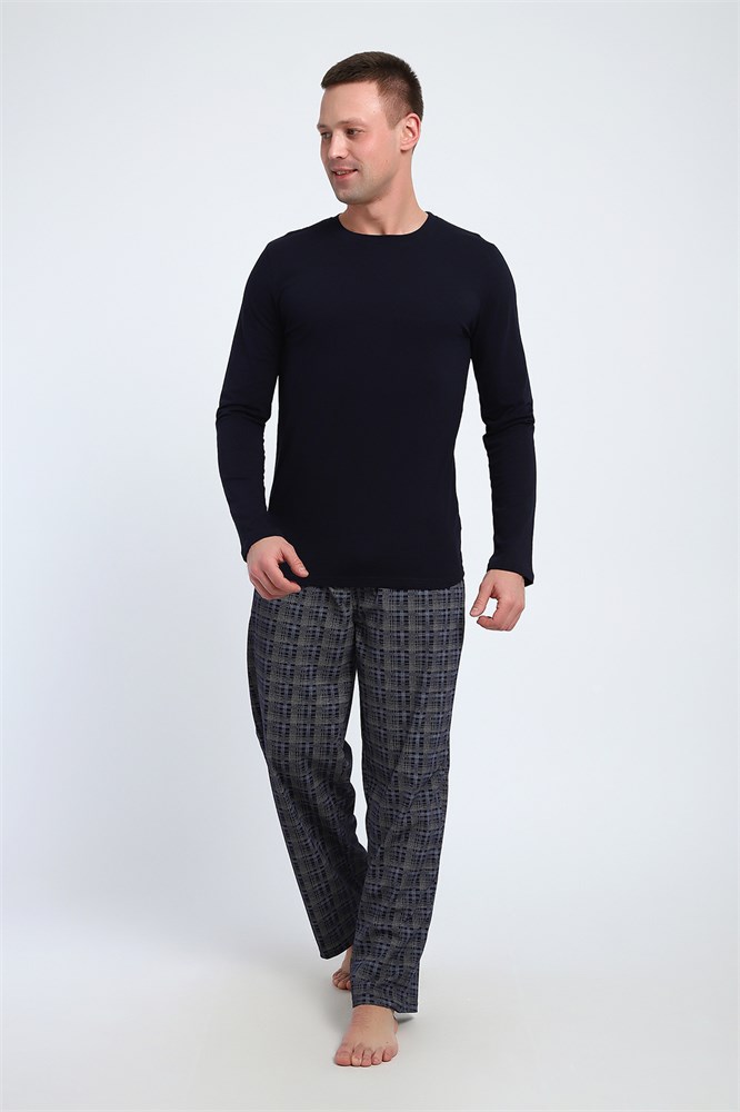 Комплект мужской из натуральной хлопковой кулирки. Темно-синий. Брюки в клетку с карманами, пояс на резинке.