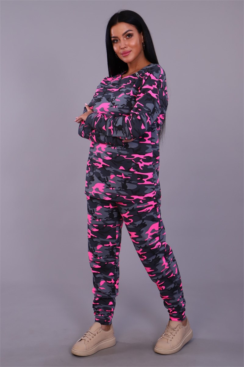 Женский брючный костюм из футера прямого силуэта. Брюки свободные, с внутренними карманами на передней части, толстовка с длинными рукавами без воротника, небольшая декоративная черная лента с белой надписью слева у горловины и на рукаве.