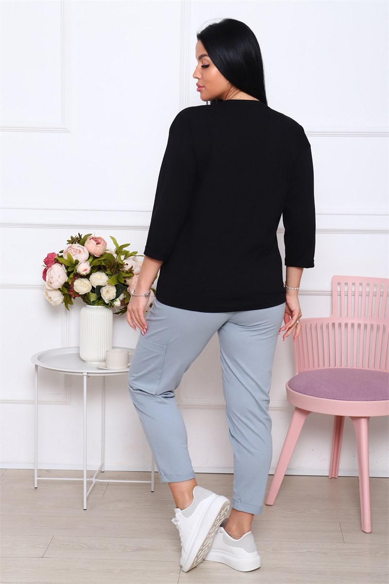 Костюм Кэжуал, стильная и элегантная футболка с рукавом 3/4 с подворотами и с печатью на полочке. Спинка футболки немного длиннее полочки. Брюки укороченные с подворотами, с одним карманом на левой брючине, пояс широкий, эластичный, комфортный.