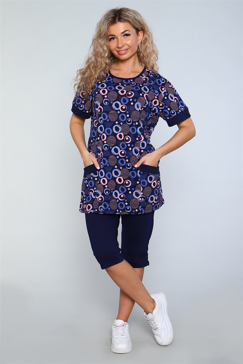 Костюм состоит из туники и бридж. Бриджи с карманами, длиной ниже колена. Туника с короткими рукавами на манжетах. Полочка с отрезными бочками и накладными карманами. Неотъемлемый элемент домашнего гардероба.