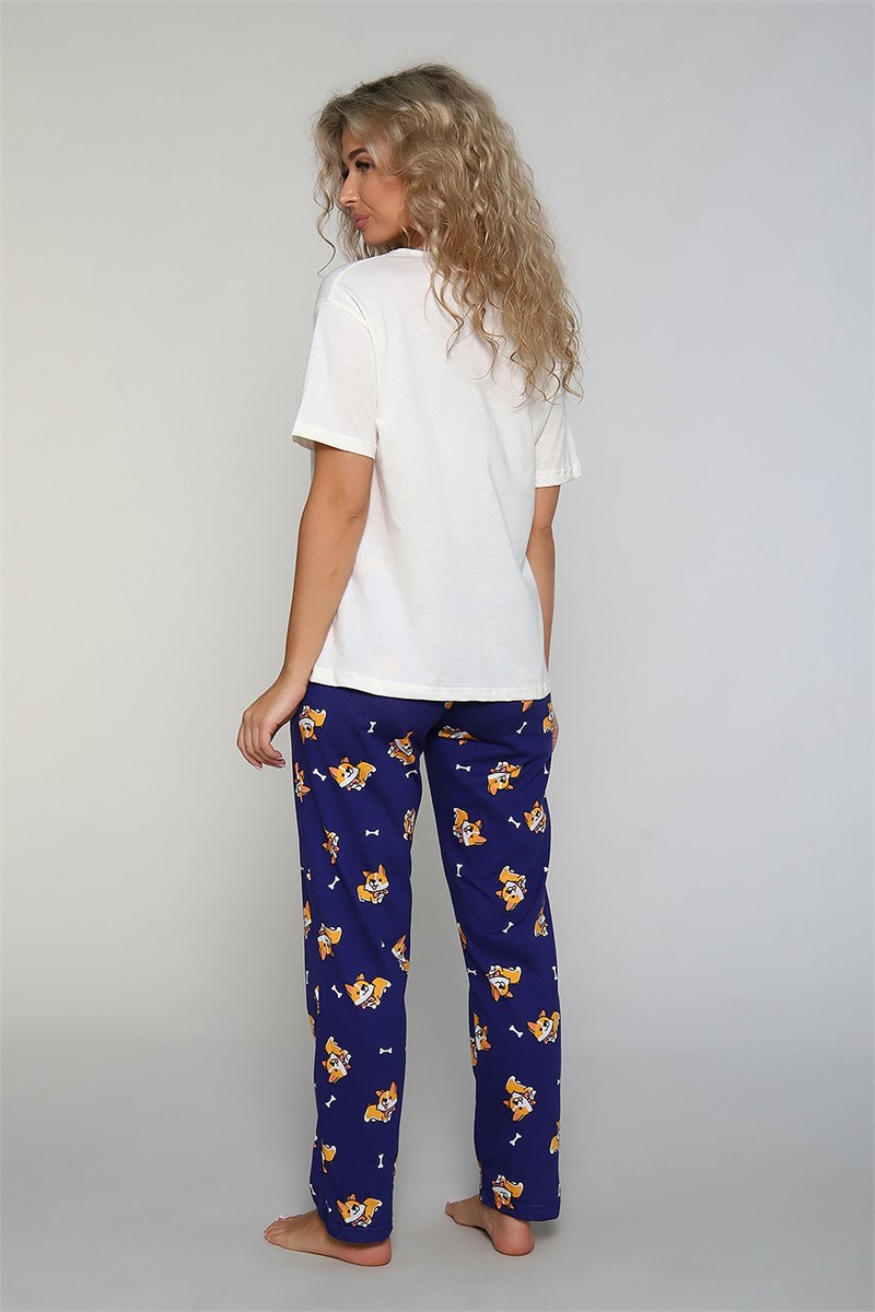 Костюм домашний состоит из брюк и футболки. Футболка с короткими рукавами, V - образным вырезом и принтом. Брюки длинные. Неотъемлемый элемент домашнего гардероба.