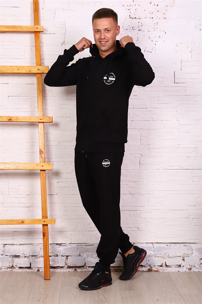 Мужской костюм толстовка+брюки. Толстовка с капюшоном, застегивается на молнию, на полочке карманы - кенгуру, рукава и низ отделаны манжетами. Брюки с карманами, внизу манжеты.