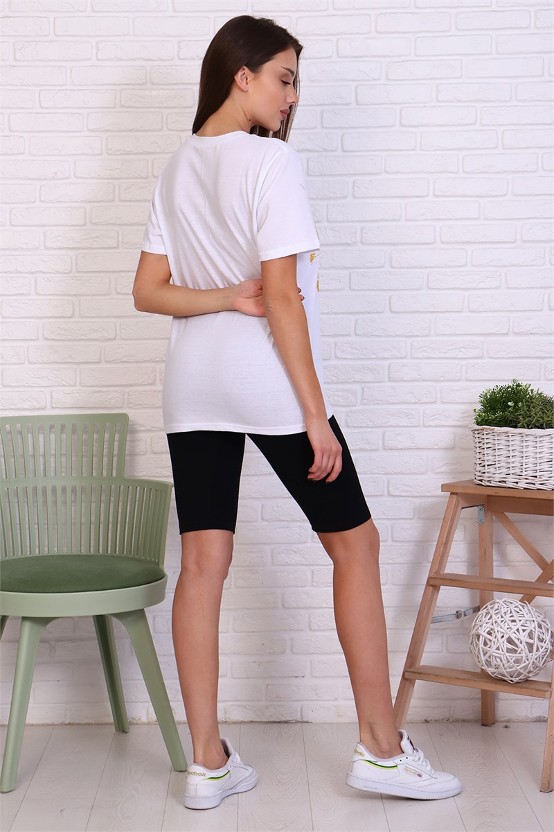 Молодежный  костюм футболка и велосипедки. Футболка из кулирки 100% хлопок  свободного кроя, стиль oversize, втачным коротким рукавом горловина округлой формы. На полочке изделия принт. Низ рукава и низ изделия подгибка. Велосипедки из кулирки с лайкрой облегающего силуэта без бокового шва. Низ изделия подгибка.