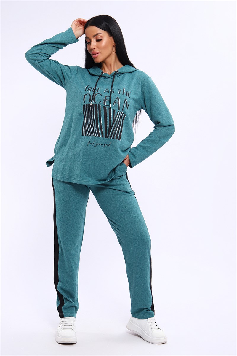 Мягкий и уютный женский костюм для дома, изготовленный из высококачественного, приятного телу трикотажного полотна, состоящего на 50% из хлопка. Комплект представлен в трех расцветках. На полочке кофты имеется принт, придающий изделию особый шарм. Дополнительным декором кофты служит капюшон. По бокам брюк расположены лампасы из ткани контрастного цвета. Костюм красиво сидит на фигуре, подчеркивает ее достоинства и при этом не стесняет движений. В нем Вы будете чувствовать себя комфортно и уверенно.