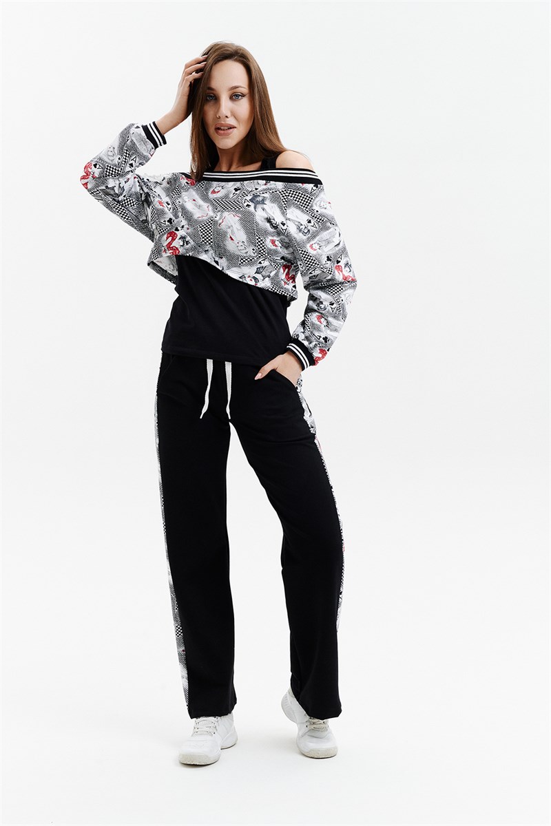 Костюм женский - тройка, состоит из майки прилегающего силуэта, широких, прямых брюк с цветной вставкой по бокам и короткого свитшота свободного силуэта со спущенной линией плеч. Оригинальный, модный костюм, который подойдет для прогулок, встреч с друзьями, активного отдыха и путешествий.