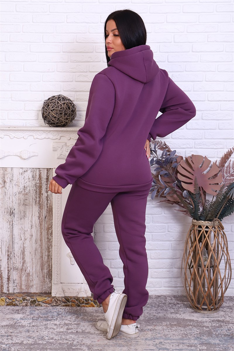 Костюм женский из футера 3-х нитки с начесом, качество пенье, что придает костюму еще больше комфорта и тепла. Кофта свободного кроя с капюшоном, карманы прорезные обработаны обтачкой. Пояс на резинке из кашкорсе. Брюки с карманами, пояс на резинке 4 см из кашкосе, низ брюк обработан резинкой под загиб.