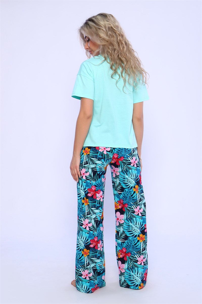 Женский домашний костюм - пижама, состоящий из футболки и брюк Листья из трикотажного полотна 100%-го хлопка. Приятный дышащий материал идеален для изготовления домашней одежды. Футболка свободного кроя, с круглой горловиной и втачным спущенным коротким рукавом, в которой будет одинаково приятно спать и заниматься домашними делами. Оригинальный, яркий принт обязательно поднимет настроение. Брюки прямого силуэта свободного кроя, с карманами в боковых швах. Мягкий удобный пояс на резинке не перекрутится, т.к отстрочен на поясной машине. Пижамка не изменит свой внешний вид после стирки при соблюдении рекомендаций по уходу и будет долго вас радовать. Обязательно возьмите этот костюм в отпуск. Отличный подарок для всех девушек и женщин на любой праздник!