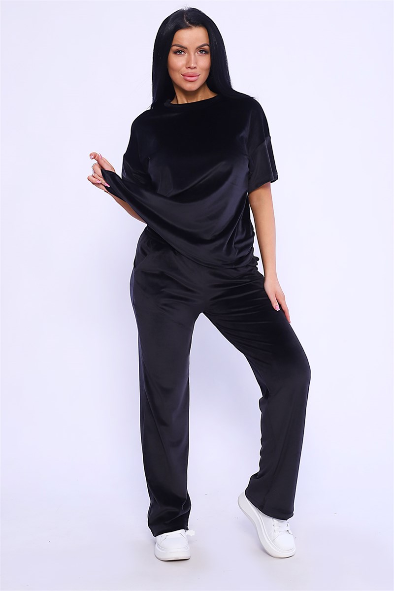 Костюм женский велюровый, повседневный, всесезонный. Костюм состоит из футболки и брюк. Футболка оверсайз прямого силуэта, длиной до бедра. Рукав втачной со спущенным плечом, длиной чуть выше локтя. Горловина с обтачкой, низ футболки с подгибкой. Брюки прямого силуэта, умеренного объема. На передних половинках брюк карманы с отрезным бочком. Пояс притачной с эластичной тесьмой. Низ брюк подгибка. Замеры объема талии брюк по нерастянутой резинке.