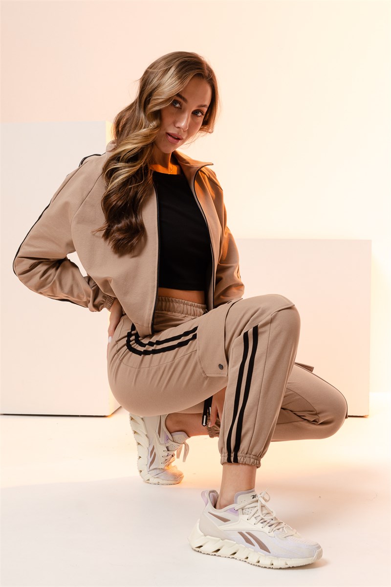 Крой ветровки укороченный, с воротником-стойка, по рукавам контрастные полоски. Брюки в стиле карго с полосками по бокам, высокой посадкой имеют прямой крой, брюки будут держать модную планку еще несколько сезонов. За счет своего удобства и комфорта этот фасон стремительно набирает популярность. Легкий комплект произведен с учетом большинства особенностей фигур. Исходя из этого, отлично подойдет как для худеньких девушек и подростков, так и для полных, как для высоких, так и для среднего роста женщин.