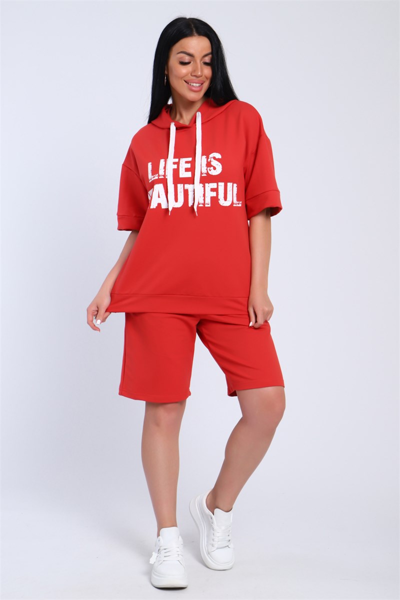 Костюм женский,выполн6ен из футера 2‑х нитки. Кофта свободного кроя со спущенным рукавом до локтя, длина до середины бедра в зависимости от роста, с капюшоном, по передней части принт. Шорты до колена с карманами. На модели 48 размер. У костюмов кофта сдвоенные размеры.