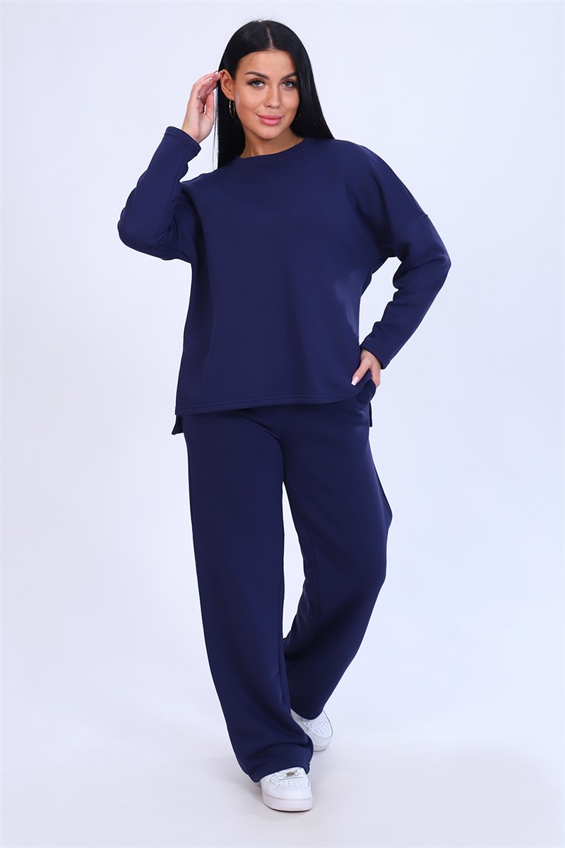 Брючный костюм для женщины давно уже стал незаменимой деталью гардероба, а в зимнее время еще и прекрасной возможностью утеплится, не отказываясь от стиля и элегантности. Как правило, материал играет важную роль в ощущении тепла и уюта, в этой модели мы использовали футер 3-х нитку диагональ петля, где воздушная петелька на изнанке создает прослойку мягкости. Туника выполнена со спущенным рукавом, с декоративными разрезами по бокам изделия. Карманы брюк выполнены в рамку, низ брюк вподгибку, пояс обработан на спецмашине. Рекомендованная температура стирки 30-40 С. На модели размер 48, пояс на брюках хорошо тянется!