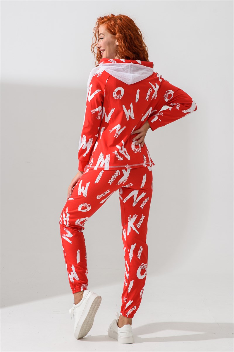 Костюм состоит из толстовки и брюк. Брюки на поясе, с боковыми карманами, на резинке по низу. Толстовка прямая, на молнии, с капюшоном из сетки, с карманами кенгуру, длиной до середины бедра. Рукав реглан, длинный, с лампасами из сетки вдоль рукава, на манжете.