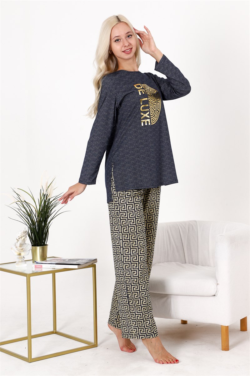 Костюм состоит из туники и брюк. Туника прямого силуэта, с округлой горловиной, длиной до середины бедра и удлиненной спинкой. Спинка с кокеткой. Рукав втачной, длинный. Горловина обработана бейкой из основного полотна. Брюки свободные, прямые, с боковыми карманами, на поясе.