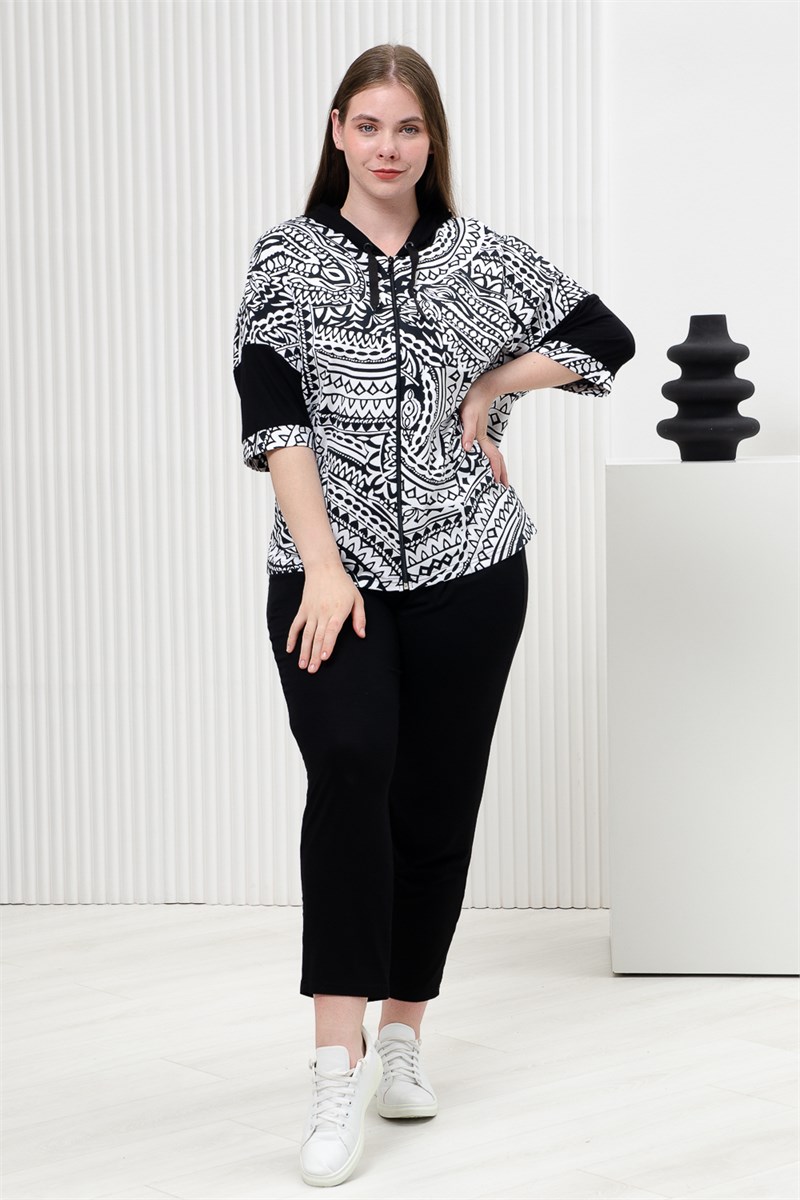 Костюм состоит из толстовки и брюк. Толстовка прямая, свободная, с капюшоном, на молнии. Рукав короткий, на манжете. На полочке расположены фигурные накладные карманы. Брюки на поясе, с боковыми карманами. В верхней части передних половинок по шву притачивания пояса расположены складки.
