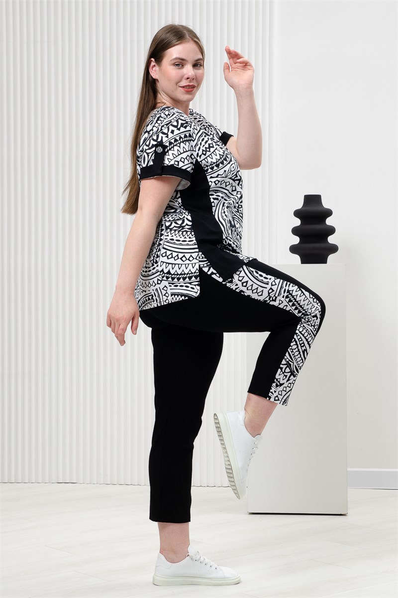 Костюм состоит из туники и брюк. Туника прямого силуэта, с V-образной горловиной, с боковыми вставками из отделочного полотна, с разрезами в нижней части боковых швов. Спинка с кокеткой, удлиненная. Рукав втачной, короткий, с манжетом и хлястом с пуговицей. Горловина обработана бейкой из отделочного полотна. Брюки на поясе, с боковыми карманами, с лампасами из отделочного полотна вдоль боковых швов.