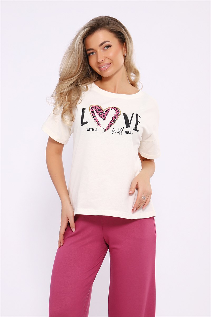 Костюм женский (брюки и футболка с принтом). Брюки данной модели выполнены из качественого трикотжного полотна футер 2-х нитка с довавлением вискозы, очень приятная и комфортная ткань. По бокам присутствуют карманы и пояс втачной с отстрочками. Футболка с втачным рукавом но со пущеным плечом, свободного кроя. Выполнена из трикотажного полотна кулирка ( хлопок 100%). Отличная модель для дома и отдыха.