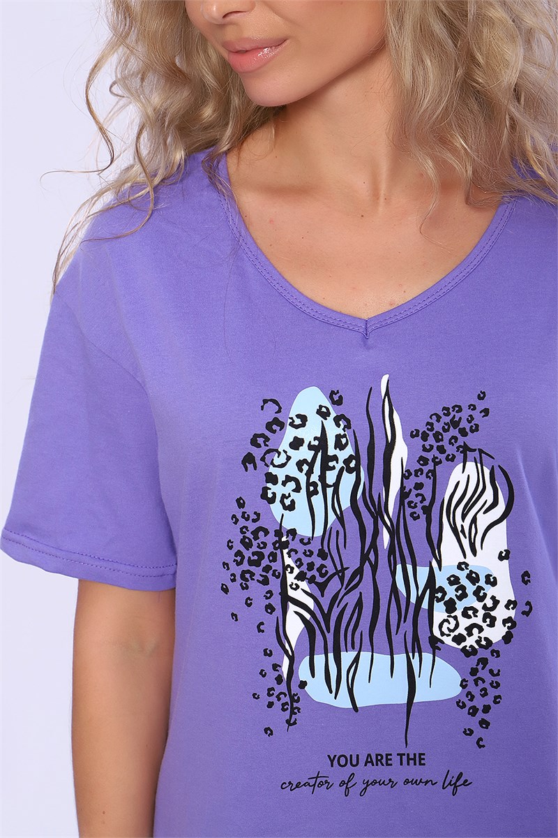 Костюм состоит из футболки и брюк. Брюки с карманами и на резинке внизу. Футболка с короткими рукавами, V - образной горловиной и небольшими разрезами в боковых швах.