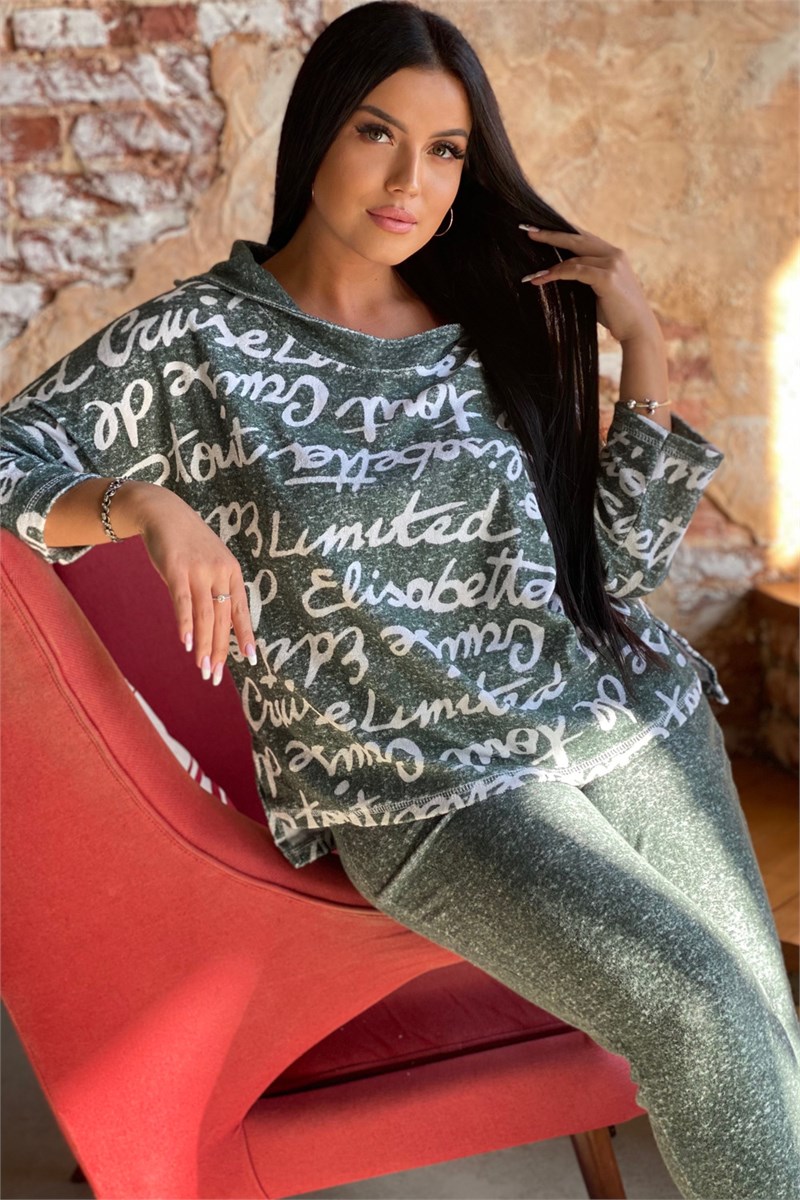 Костюм женский: туника и брюки. Туника прямого силуэта с цельнокроенным рукавом 3/4, со швом. Воротник отложной, спереди переходит в стойку. Полочка короче спинки, по боковым швам разрезы. Брюки полуприлегающие, с манжетами. На передней половинке внутренние карманы.