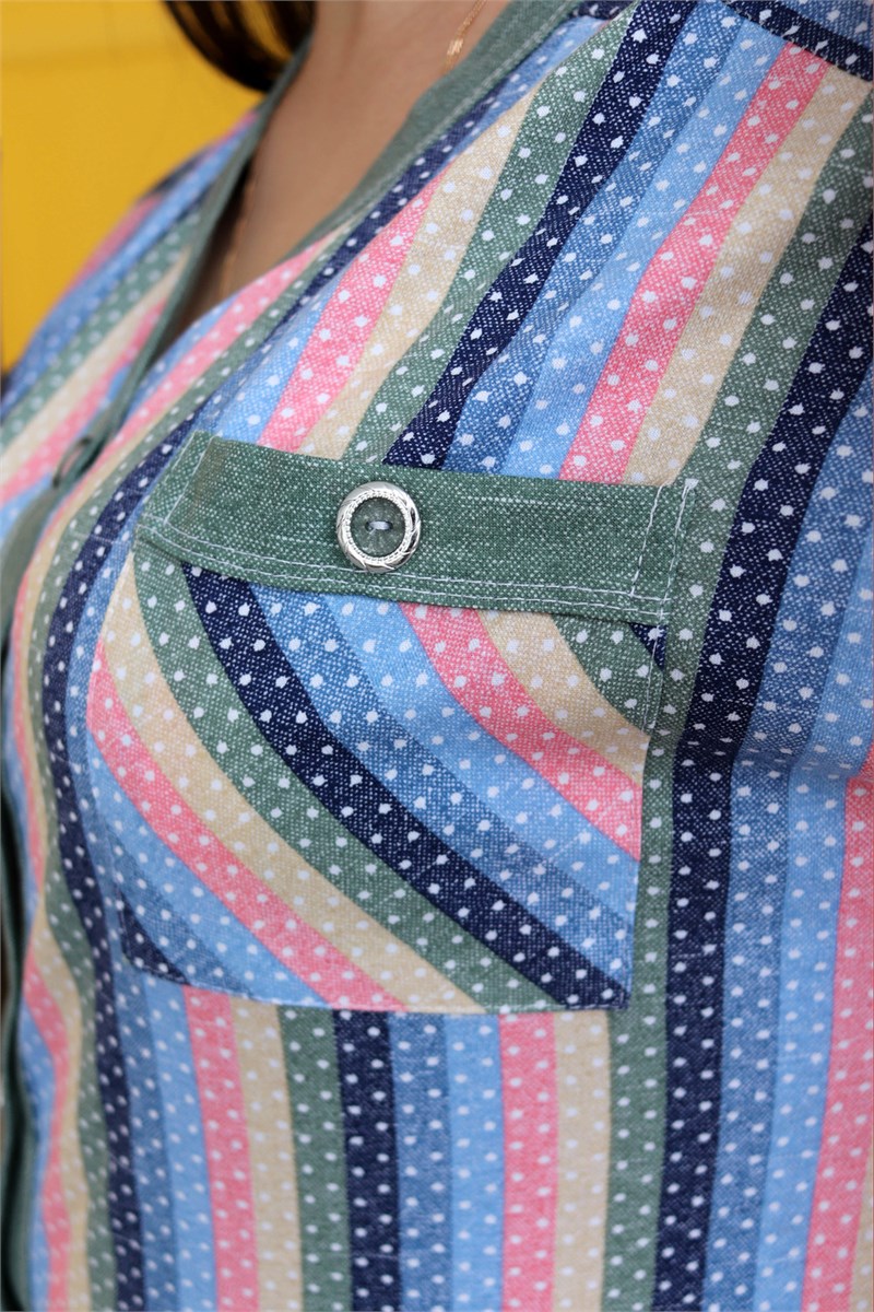 Костюм женский: туника и брюки 7/8. Застежка на петли - пуговицы. Туника и манжеты брюк из ткани в полоску. Борт туники, низ рукавов и обтачка накладного кармана полочки обработаны широкой окантовкой из отделочной ткани. Брюки полуприлегающие на поясе, обработанном на многоигольной машине. На передней части брюк два внутренних кармана. На модели 52 размер