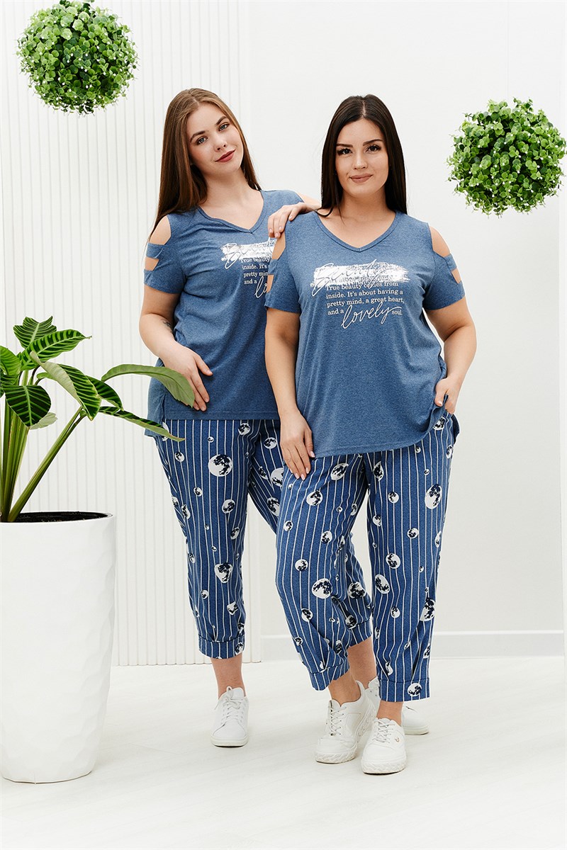 Костюм женский: туника и брюки. Туника прямого силуэта, вырез Y-образный. Полочка несколько короче спинки, сбоку разрезы. На полочке принт. Рукав не цельный, два хляста, расположенные через расстояние друг от друга, втачаны в боковые части рукава. Брюки свободные, бананы, внизу передней и задней части по две встречные складки, манжеты. В брюках удобные внутренние карманы, пояс выполнен на многоигольной машине.