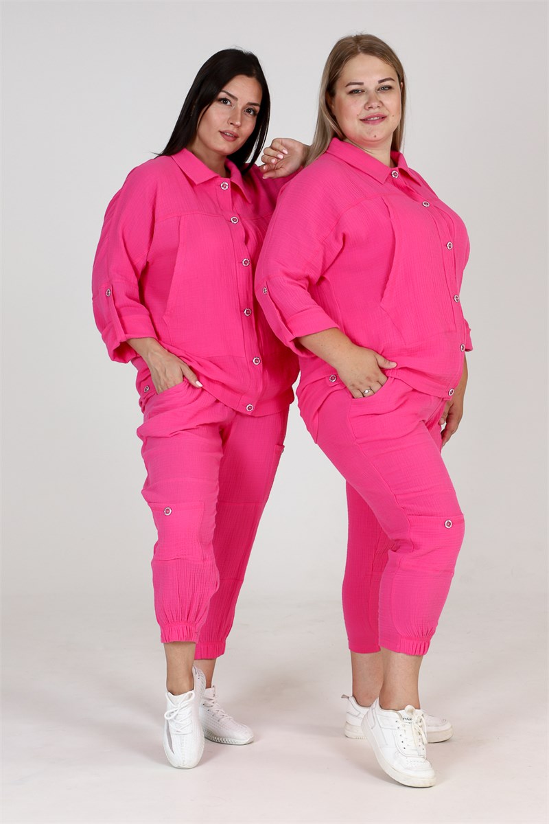 Костюм женский: Куртка и брюки. Куртка прямого силуэта, воротник втачной, на полочке кокетка и накладной карман типа кенгуру, застежка на планке на петли - пуговицы (петли с глазком). Рукав цельнокроенный со швом с манжетой и хлястом. Внизу полочки пояс, сбоку пояса резинка. На спинке кокетка, по центру декоративная складка с двумя пуговицами. Внизу бокового две декоративные паты с пуговицами. Брюки свободные по бедрам, внизу передние половинки брюк собраны на резинку. Передняя часть брюк состоит из трех частей. В верхней части внутренние накладные карманы. Накладной карман на верхней левой и средней правой частях брюк. Пояс выполнен на многоигольной машине.