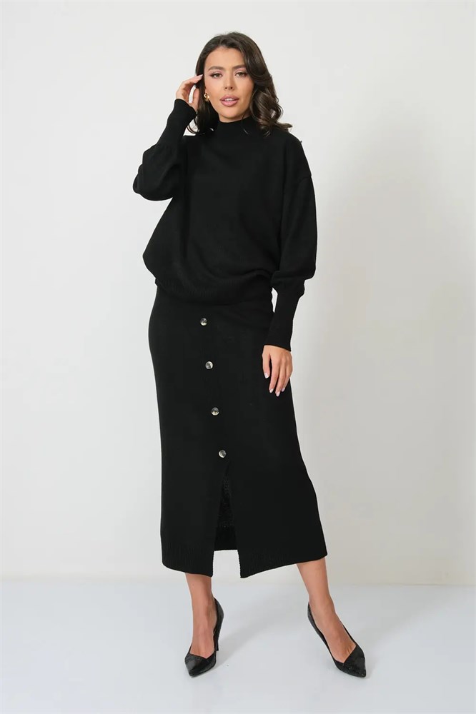 Вязаный женский костюм состоит из юбки и джемпера. Свободный джемпер с горлом и длинным рукавом. Юбка прямого силуэта с разрезом спереди и имитацией застежки на пуговицы, в пояс юбки горизонтально проложена эластичная резинка. Вязаный костюм - идеальный вариант для модных женщин, которые хотят выглядеть стильно и элегантно. Костюм выполнен из качественной пряжи с содержанием шерсти, что обеспечивает комфортную посадку и приятные ощущения при ношении. Юбка с разрезом и свободный свитер с горлом и длинным рукавом придает образу изысканность и строгость. Вы будете выглядеть профессионально и стильно, не потеряв при этом своего женственного обаяния.